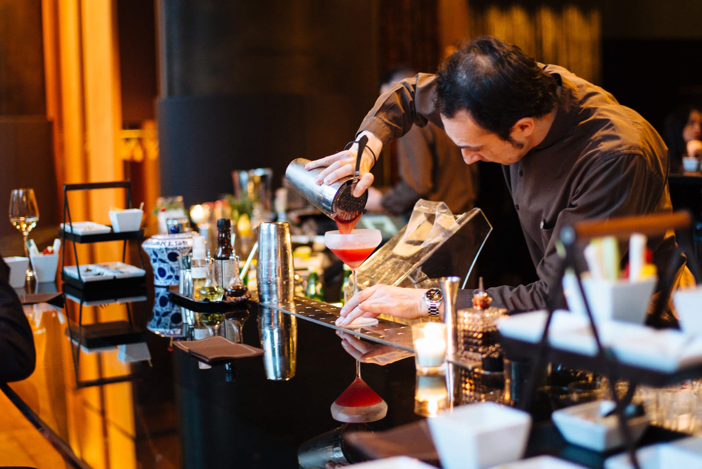 The cocktail list is categorized by Classics, Martinis, Bulgari Bar Specials, and Overseas Cocktails (mostly classic American cocktails e.g., Corpse Reviver, Mint Julep, etc.). Of course, we wanted to try one of the Bulgari specials, so we ordered the Bulgari (Gin, Aperol, orange, pineapple, and lime). The presentation of the cocktails is stunning (that glassware!) and the cocktails come with a tower of savory bites.