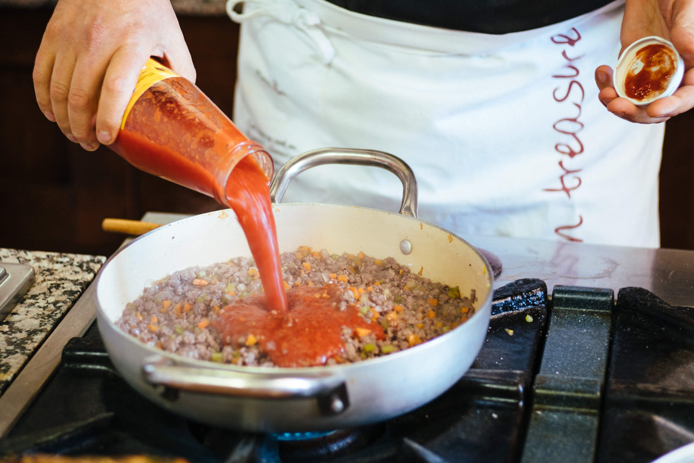 While perusing the tomato aisle at the grocery store, we’re all met with jars and cans of diced, pureed, stewed, crushed, peeled and whole tomatoes, as well as tomato sauce. How do you know which is the best to use for your pasta? When we were in Italy, Chiara from Mamma Agata’s, told us that we should taste test our tomatoes to find the sweetest option. You don’t want tomatoes with added sugar, but you do want tomatoes that are picked at the peak of ripeness. We often buy Mutti tomato puree, but we recently decided to blind taste test a few of the options on our grocery shelves. It’s actually a great exercise to taste the difference in acidity and sweetness.